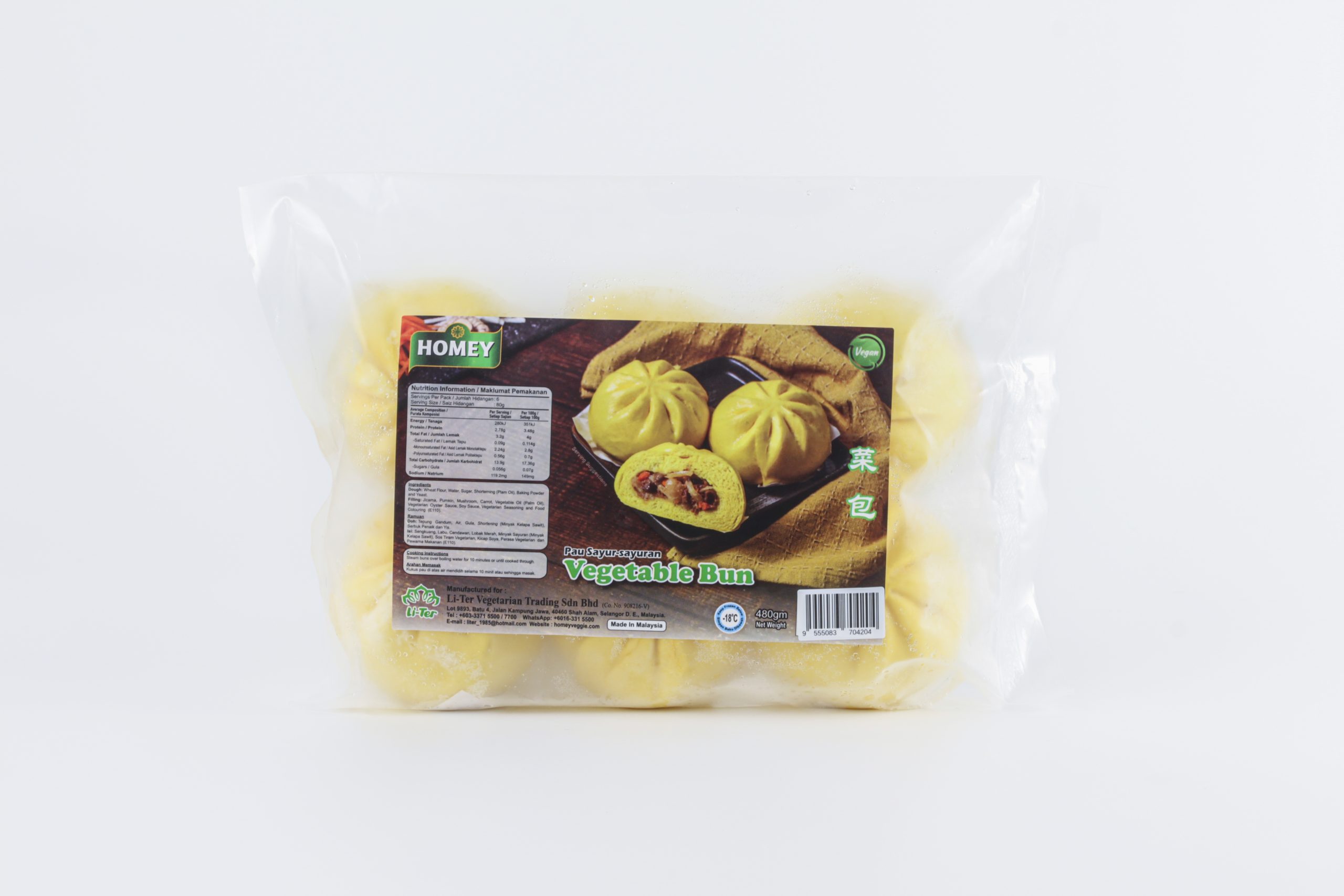 Ingredient :Wheat Flour Yeast,Baking Powder,Water,Mushroom,Jicama,Carrot,Permitted Food Colouring and Vegetable oil, Vegetarian Seasoning.